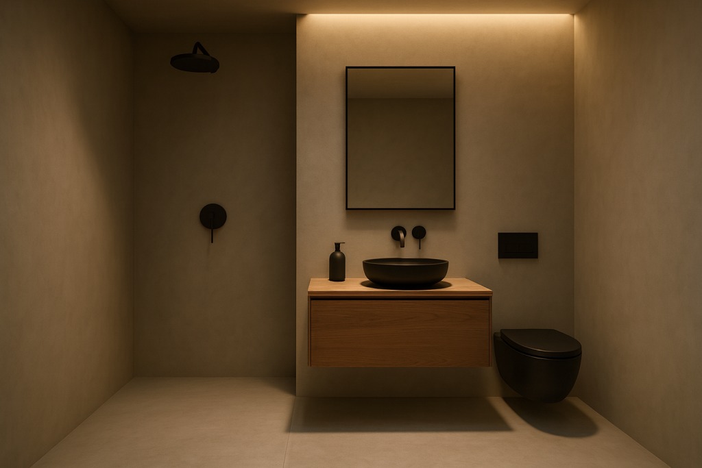 - Spachteltechniken und Mikrozement: Mikrozement oder Kalkmarmorputze (z. B. Tadelakt, Beton Ciré) werden in mehreren dünnen Schichten aufgetragen und versiegelt. Das Ergebnis ist eine glatte oder leicht strukturierte, wasserfeste und sehr belastbare Oberfläche. Farbe und Textur lassen sich individuell gestalten – beliebt in Bädern und Duschen.