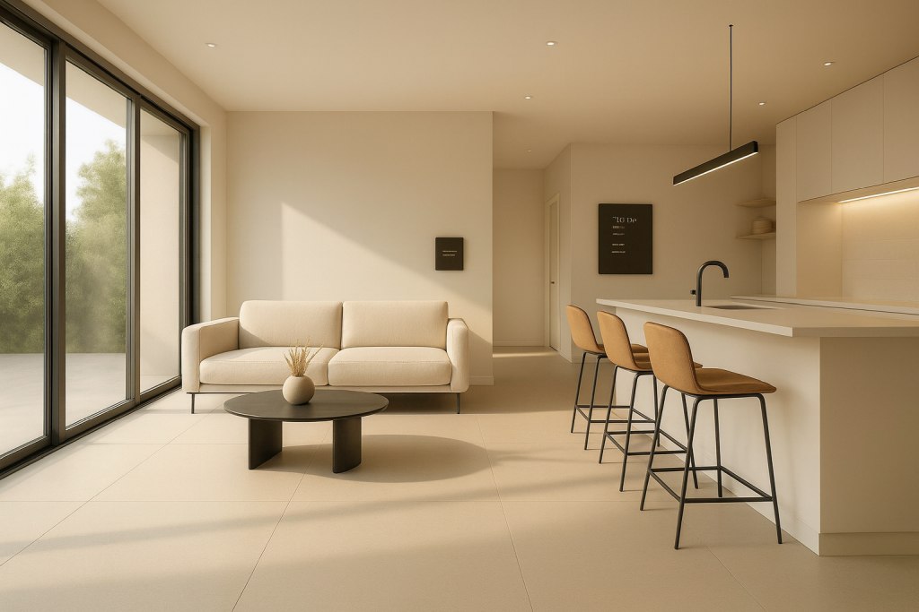 - Wohnräume: Große Fliesen oder fugenlose Estriche schaffen ein ruhiges, einheitliches Bild – ideal für offene Grundrisse. Sichtbeton oder geschliffener Designestrich setzen einen urbanen Akzent.